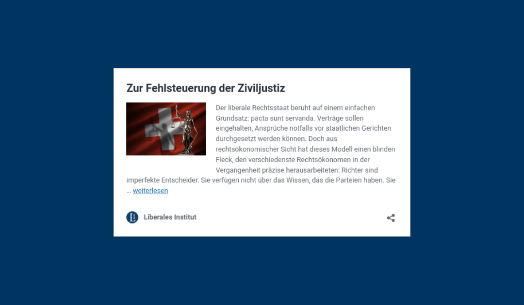 Weiter lesen: Liberales Institut, „Zur Fehlsteuerung der Ziviljustiz“ (Link: https://www.libinst.ch/denkanstoesse/zur-fehlsteuerung-der-ziviljustiz/)