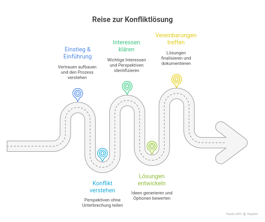 Konflikte gehören zum Alltag – sei es in Unternehmen, Projekten oder Teams. Entscheidend ist, wie wir damit umgehen. Mediation bietet einen strukturierten und bewährten Weg, um Spannungen konstruktiv zu klären und tragfähige Lösungen zu finden. Die folgende Grafik zeigt den Ablauf in fünf klaren Schritten: